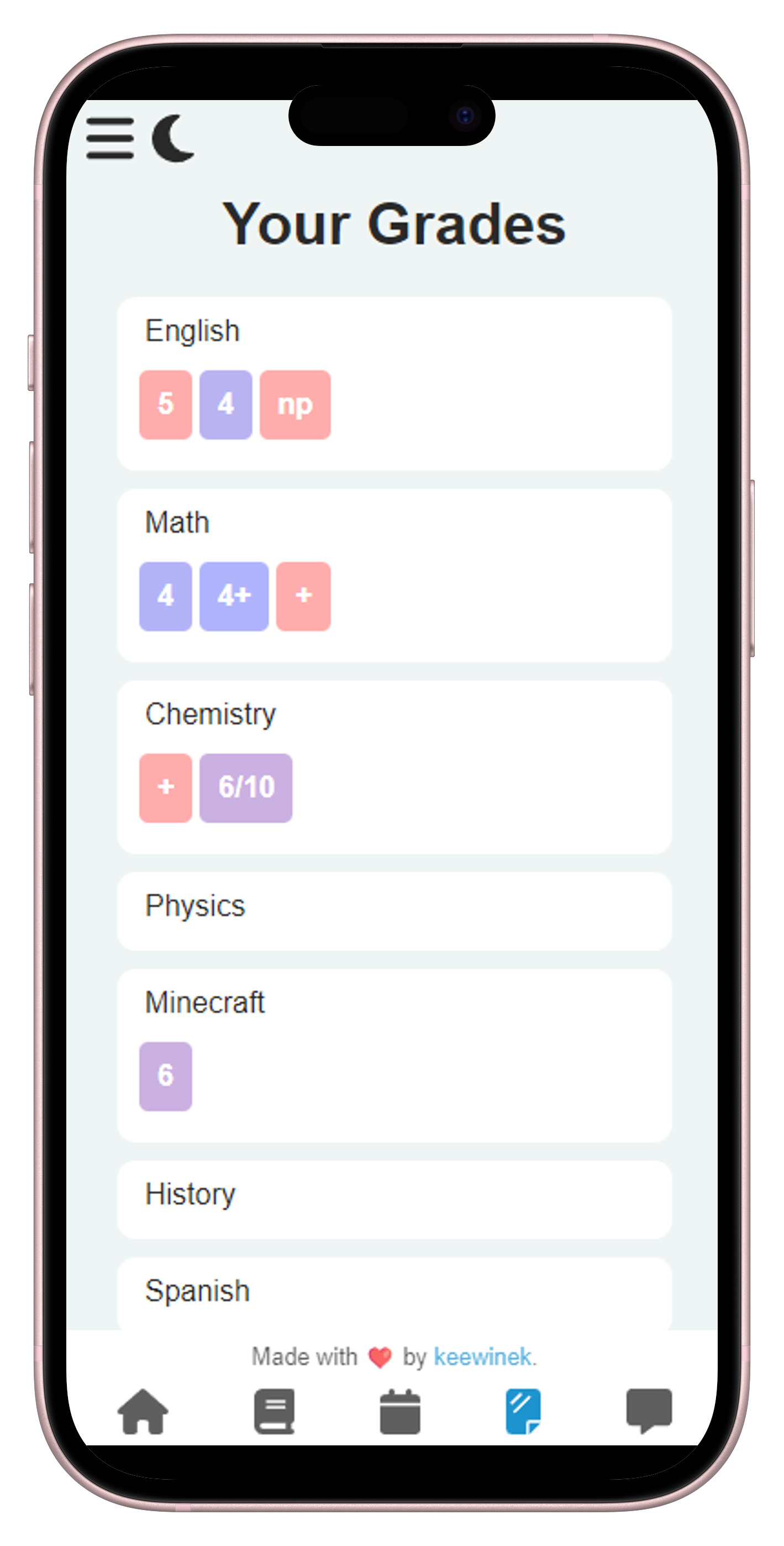 You can see all your grades, in a slim modern ui, that makes your grades easy to read. Also, the grades with long content will only get few letters displayed, but you can click it to display all grade's information (it works with any grade).