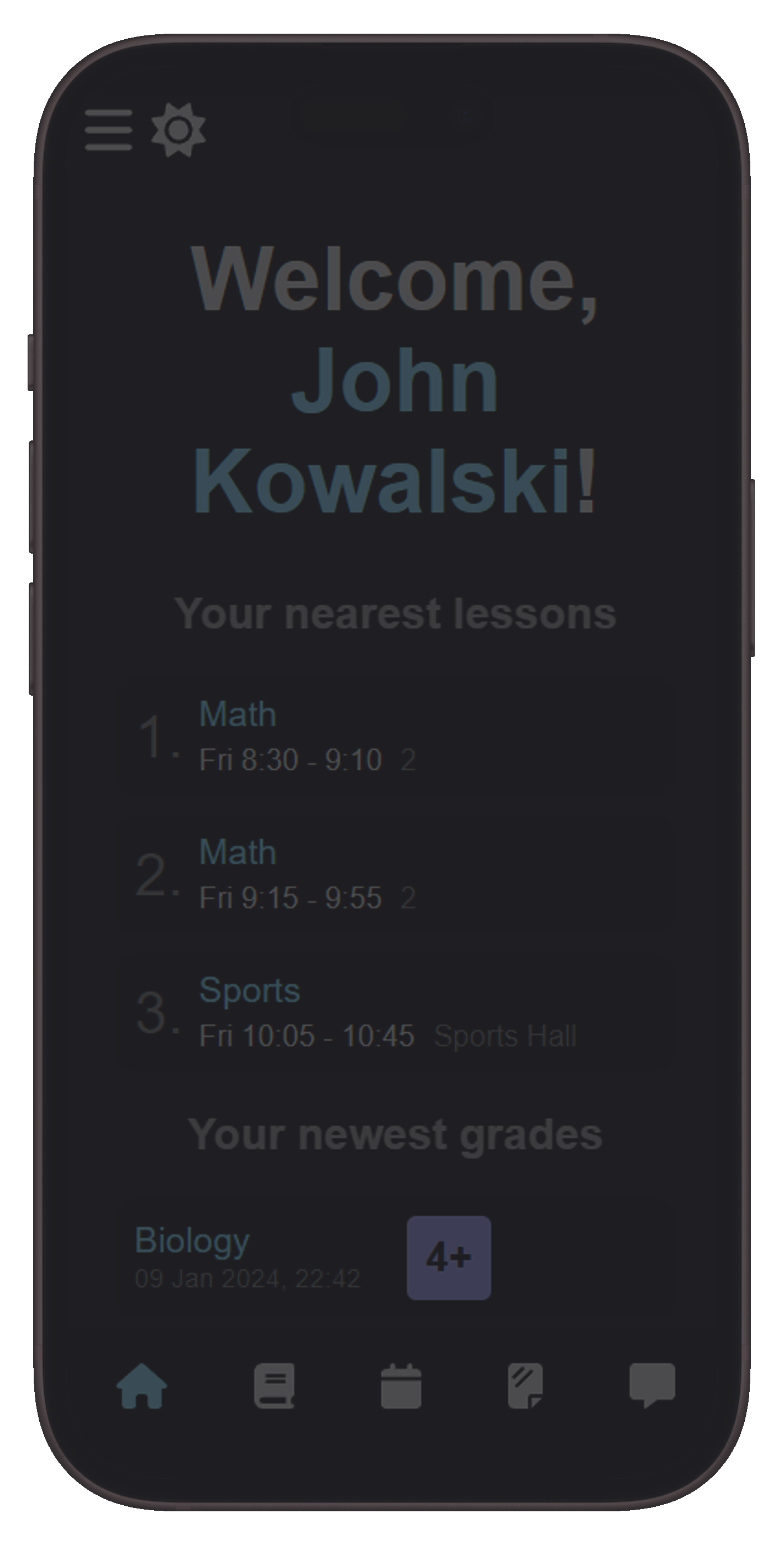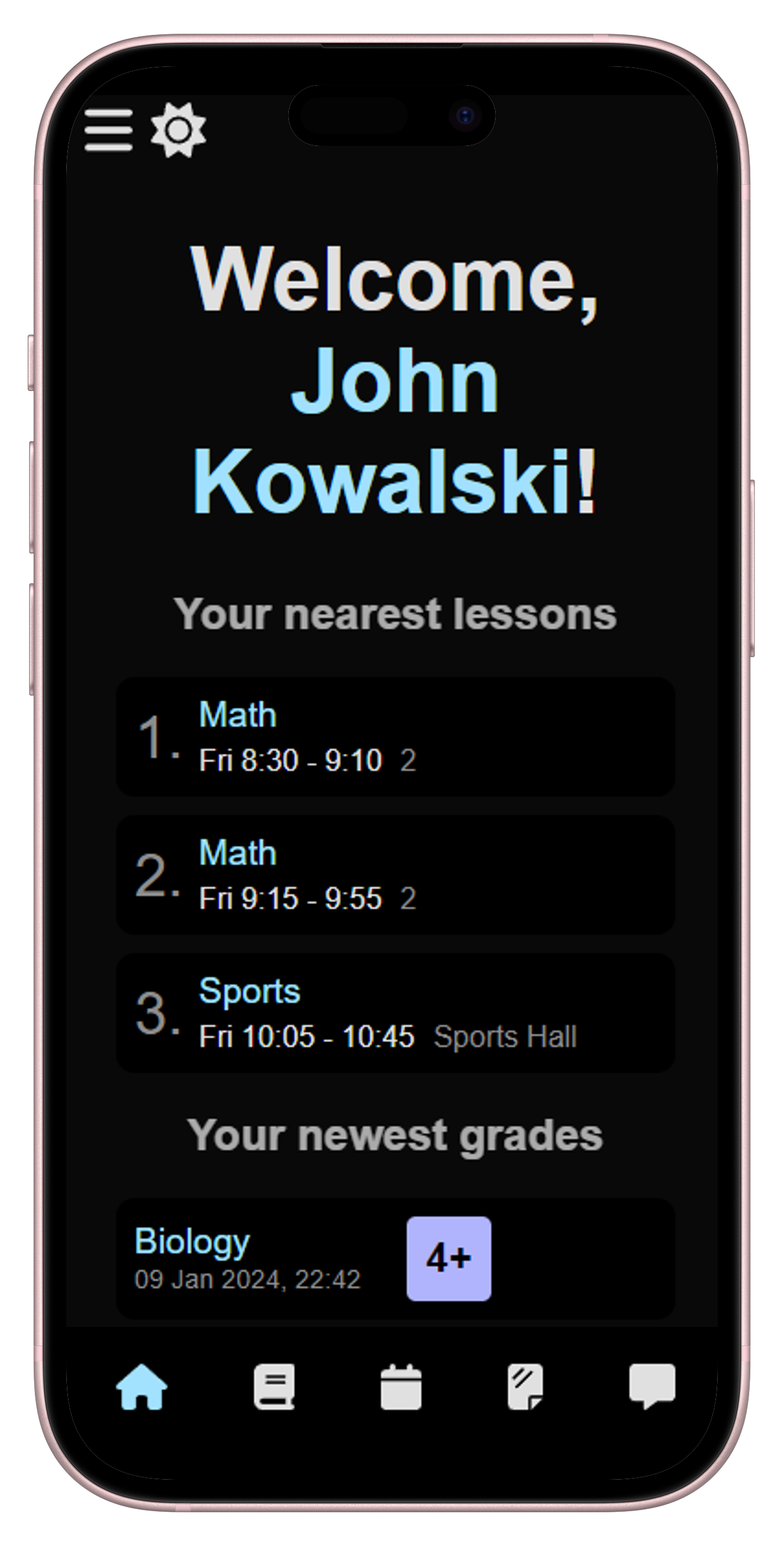 Once you login to BtIDU, you will see your three nearest lessons, and the information about the classroom where the lesson would take place. Also, on your home screen, you will see your 5 newest grades, your next exams and newest homeworks.