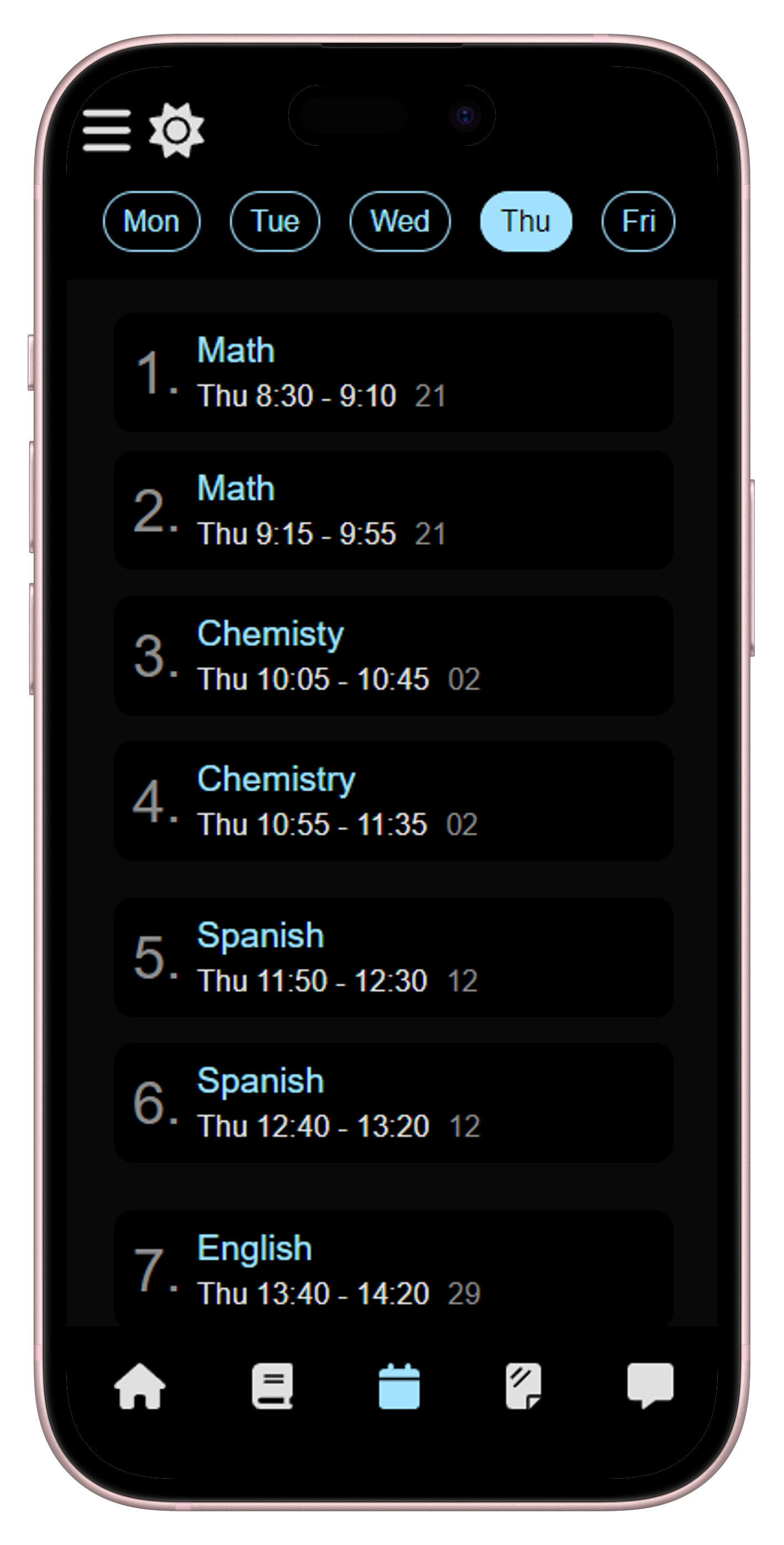 I have completly remade the old, outdated schedule display and made it more intuitive and user-friendly. It automaticly shows you the day, that you will have the nearest lessons Ex. tommorow, if you have ended your today's class. The spacings between lesson objects, represent the brake length. Bigger gap = longer brake.