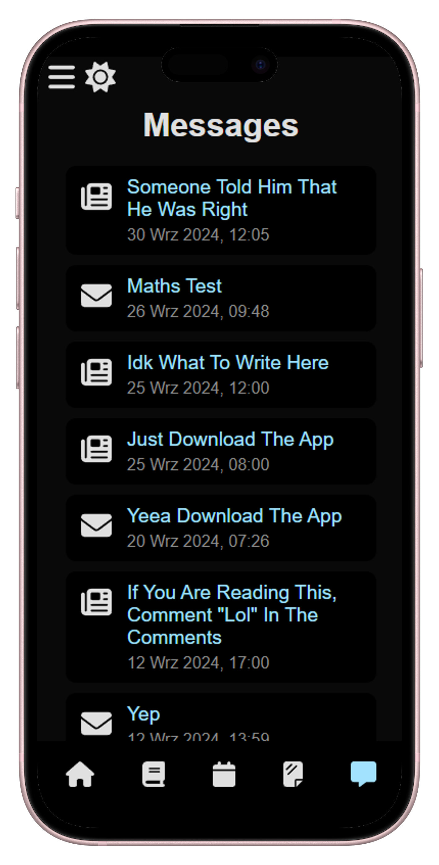 BtIDU has a lot more funcionalities, that will make your time with idu a pleasent expirence, such as auto logining you in to the idu, so that you wont need to remember your idu password and login (The login data is beeing encrypted and stored only on your local device). The image on the right shows the messages panel, that makes all your messages, anoucments and school news in one place.